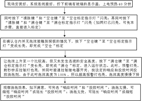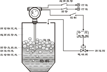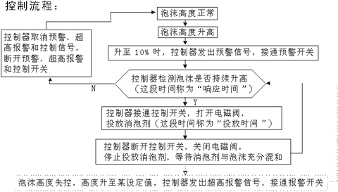 當泡沫高度上升至淹埋控制器部份探極(約10 %)時,控制器首先發出一個預警開關信號,表示泡沫升高,準備投放消泡劑,當預警狀態維持若干秒鐘(此稱響應時間,可選),確認泡沫的持續存在后,控制器再發出一個控制開關信號,指揮打開電磁閥,投放消泡劑;為節省消泡劑,投放若干秒后(此稱投放時間,可選),控制開關斷開,關閉電磁閥,停止投放;待消泡劑與泡沫充分混合,如泡沫仍未下降,則再投放,然后再停止......反復進行,直至泡沫高度下降到離開探極預警處為止。所以消泡劑的投放是間歇進行的,即投放一段時間,然后停一段“響應時間”,泡沫高度不降時再投。用戶可通過選用不同的“響應時間”和“投放時間”達到*佳消泡效果。如果因為某種原因(例如消泡劑管道堵塞),未能及時消泡以至泡沫失控升高,則當泡沫升至某設定高度時,控制器發出超高報警信號,以便人工干預。